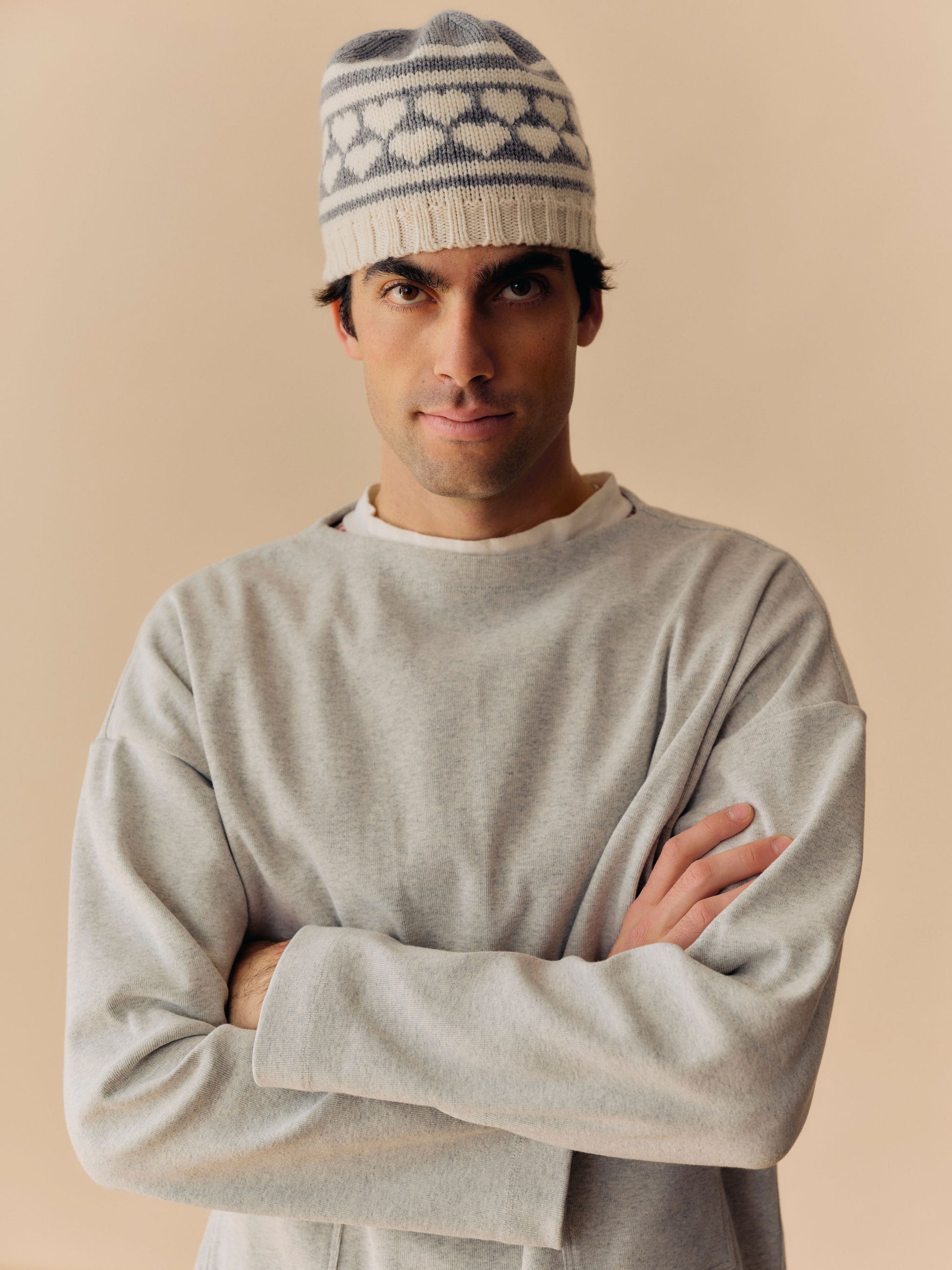 Inspired by hand knit hats made by Victor's mom. These are machine made in New York out of a 90% Wool/ 10% Cashmere blend. One color-way in light grey in cream. One size fits all.
